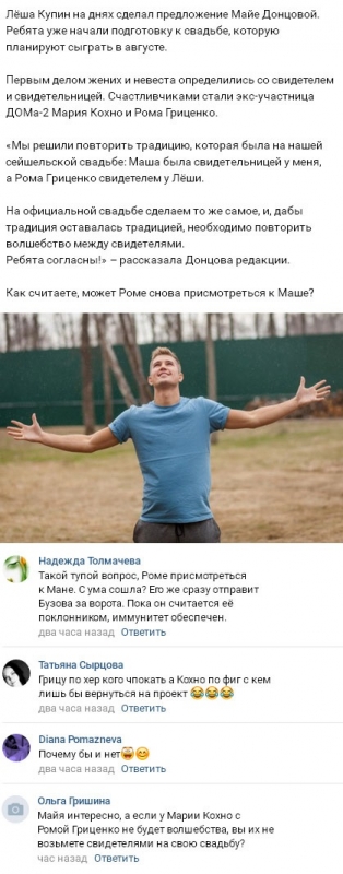 28 апреля 2018 года Мария Кохно приложила усилия к тому, чтобы обратить на себя внимание Романа Гриценко, поскольку у Маши появилась такая возможность. Несмотря на явное неверие окружающих в подобный поворот событий, Алексей Купин не только возобновил взаимоотношения с Майей Донцовой, но и сделал девушке официальное предложение руки и сердца. Хотя эти двое еще не подавали соответствующего заявления в ЗАГС и не выбрали пока точной даты бракосочетания, Алексей и Майя уже остановились на определенных кандидатурах свидетелей. Выяснилось, что Донцова и Купин решили повторить церемонию, проведенную ранее на Острове любви, и пригласить на достойные роли Романа Гриценко и Марию Кохно. При этом Майя вовсе не против того, если свидетели снова прибегнут и к еще одной свадебной традиции, речь идет о физической близости между Машей и Ромой. Фанаты телешоу не исключают возможности такого развития ситуации. Ведь в настоящее время у Кохно нет близкого друга, и молодая женщина активно ищет для себя подходящего партнера. Да и Гриценко, ухаживания которого уже неоднократно отвергала телеведущая Ольга Бузова, вполне способен согласиться на интим с блондинкой, в особенности учитывая тот факт, что они уже обладают совместным опытом в соответствующей сфере. Свое мнение о том, существуют ли реальные шансы на сближение Романа Гриценко с Марией Кохно, вы можете изложить в комментариях.