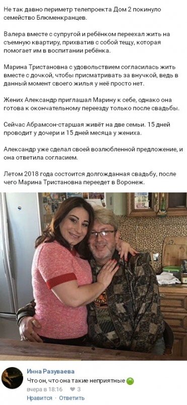25 апреля 2018 года мать Таты Абрамсон Марина Тристановна наконец сообщила поклонникам дату намеченного бракосочетания. Хотя молодые родители Валерий Блюменкранц и Тата Абрамсон изначально не намеревались уходить из периметра, по крайней мере, на протяжении пары последующих лет, они неожиданно для окружающих приняли совершенно противоположное решение. Нет ничего удивительного в том, что следом за дочерью и зятем телестройку пришлось оставить и Марине Тристановне. Правда, едва ли женщина сожалеет о случившемся, ведь в плане личной жизни у нее все складывается превосходно. Смотрите также: дом 2 28 апреля 2018 вечерний Выяснилось, что в последнее время старшая Абрамсон вынуждена существовать «на два дома». Половину месяца она посвящает заботам о маленькой внучке, а в течение двух других недель она находится в Воронеже у своего бойфренда Александра Ковалевского. Однако подобные разъезды не станут продолжаться долго. По словам самой Марины Тристановны, избранник уже успел сделать ей желаемое предложение стать его супругой. Летом 2018 года должна состояться их свадьба, после чего мать Таты окончательно переедет в Воронеж. Свое мнение о том, рады ли вы за Абрамсон-старшую, которая в скором времени собирается по всем правилам выйти замуж, вы можете изложить в комментариях.