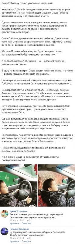 25 апреля 2018 года поклонники реалити-шоу готовы были обратить внимание правоохранительных органов на Александра Гобозова из-за совместного снимка, запечатлевшего мужчину и его сына. Невзирая на возвращение на телестройку, Саша не упускает ни единой возможности провести время с маленьким Робертом Гобозовым. Александр фактически ежедневно встречается с малышом, отвозит ребенка в детский сад, иногда появляется и по окончании съемок и укладывает сынишку спать. Смотрите также: дом 2 28 апреля 2018 Одна из подобных встреч едва не завершилась трагически. Участник телепроекта, вознамерившийся обязательно вырастить из малыша достойного представителя сильного пола, решил поучить Роберта водить автомобиль. Правда, сам Александр полностью контролировал всю ситуацию, но зрелище пятилетнего мальчика за рулем машины многих буквально шокировало. Фанаты глубоко возмущены легкомыслием и безответственностью Гобозова, ведь из-за этого могли пострадать и другие водители проезжавшего неподалеку транспорта, не говоря уже о самом ребенке. К тому же многие заметили, что за подобное поведение на Сашу необходимо наложить денежный штраф либо, что еще лучше, привлечь к несению уголовной ответственности. Свое мнение о случившемся с сыном Александра Гобозова вы можете изложить в комментариях.
