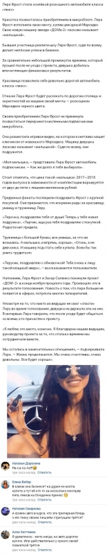 Около шести месяцев назад Лера и ее бойфренд Захар Саленко оставили реалити-шоу, намереваясь начать за пределами телепрограммы совершенно новую жизнь. Как и предполагали приверженцы телестройки, взаимоотношения этих двоих вне проекта не просуществовали долго. Однако в области бизнеса Фрост, как стало известно ее подписчикам, действительно успела добиться солидных успехов.