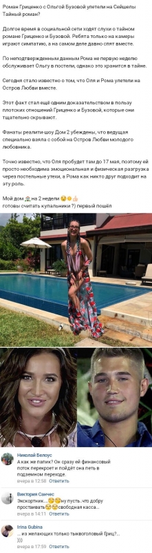 6 мая 2018 года оказалось, что Ольга Бузова полетела на Остров любви не одна, а в компании юного любовника. На протяжении долгого временного периода фанаты телевизионного проекта могли лишь предполагать, что в действительности происходит между Бузовой и участником телестройки Романом Гриценко, какие взаимоотношения на самом деле их связывают. Но лишь теперь выяснилось, что в реальности Ольга и Рома не только демонстрируют зрителям ни к чему не обязывающий флирт в эфирах телепередачи, но и регулярно вступают в интимную близость. Большинство поклонников телепрограммы с трудом верят в такую ситуацию, но парень уже в течение нескольких недель постоянно приносит телеведущей соответствующее удовольствие в моменты физических контактов. Более того, молодой человек отправился вместе с нею и на Сейшелы, чтобы на протяжении предстоящих двух недель обеспечивать Оле и физическое, и эмоциональное расслабление после напряженного труда путем волшебства. Не стоит удивляться тому, что подлинные отношения Бузовой и Гриценко содержатся в жестком секрете от публики. Но склонная к чрезмерным эмоциям проектная ведущая уже не раз невольно выдавала окружающим истину, показывая всем, насколько небезразличен ей Роман, и демонстрируя, что имеет на юношу несомненные права. Впечатление от снимка и мнение о том, удивляет ли вас известие о том, что Роман Гриценко и Ольга Бузова на самом деле весьма близки, вы можете изложить в комментариях.