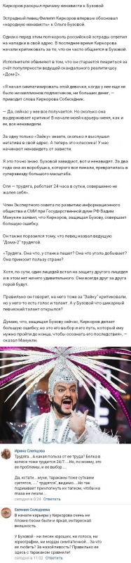 В то же время Филипп Киркоров, являющийся искренним другом Ольги, полагает, что нет ничего слишком странного в том, что многие люди явно недолюбливают Бузову. Он считает, что вся проблема заключается в обыкновенной человеческой зависти. Исполнитель не скрывает того, что ранее и ему доводилось находиться в аналогичной ситуации. В частности, после композиции «Зайка моя», быстро ставшей настоящим хитом, Филипп столкнулся с многочисленными критическими высказываниями и злобными сплетнями по поводу собственной персоны.