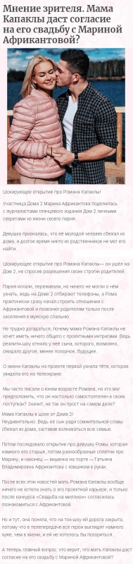 Свое мнение о том, действительно ли мать Романа Капаклы будет всячески препятствовать заключению им брачного союза с Мариной Африкантовой, вы можете изложить в комментариях.