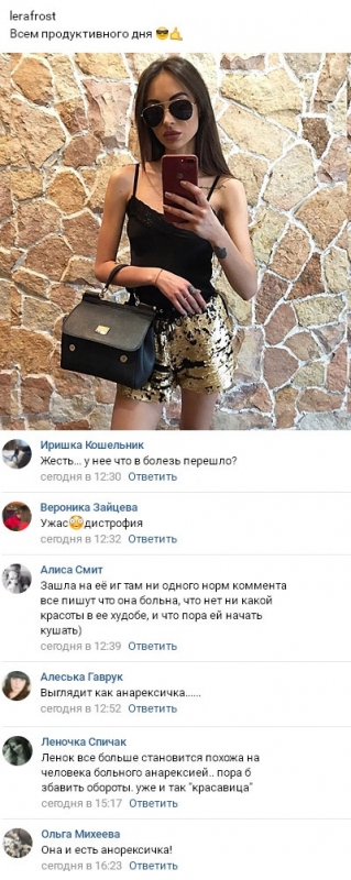 Теперь паника охватила даже тех, кто еще совсем недавно искренне восхищался худобой и стройностью этой молодой женщины. Причина страха окружающих за Леру заключается в том, что в погоне за изящной и красивой внешностью девушка усохла до такой степени, что теперь более всего напоминает страдающую анорексией. Такое положение вещей не только отрицательно сказывается на привлекательности Фрост, но и однозначно является опасным для ее здоровья.