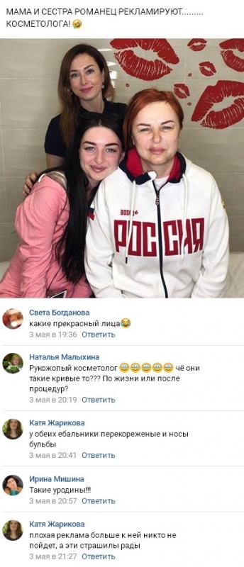При этом косметолог, которому Романец безусловно доверяет свой внешний вид, успела «поработать» не только с нею, но и с ее родней. Едва мать Виктории Ангелина и ее младшая сестра Антонина прибыли в столицу, как немедленно решили откорректировать свои природные данные. Но, исходя из фотоснимка, женщины поступили так совершенно напрасно.