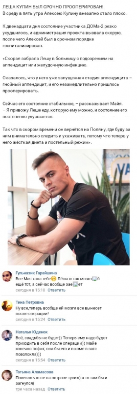 2 мая 2018 года стало известно о том, что Алексей Купин уже находился на грани ухода из жизни, однако медики все же смогли вовремя доставить юношу на операционный стол и спасти его. Уже в течение нескольких дней Леша и Майя Донцова осуществляют подготовку к свадебному торжеству. Но теперь эти двое вынуждены отложить соответствующие намерения, поскольку у Купина появились значительные сложности со здоровьем. Выяснилось, что уже в 5 часов утра в среду парень почувствовал себя не лучшим образом, тогда как в обед руководители телепрограммы были вынуждены вызвать к нему бригаду «Скорой помощи», доставившую Алексея в медицинское учреждение в связи с серьезным подозрением на аппендицит. Первоначальный диагноз получил подтверждение. К тому же аппендицит уже вступил в гнойную стадию, и парень мог в любой момент расстаться с жизнью. Однако имеется информация о том, что наиболее опасная для Купина ситуация уже осталась в прошлом. Леша был вовремя прооперирован, после чего молодой человек быстро и успешно восстанавливается и готовится к возвращению в периметр. Свое мнение о случившемся с Алексеем Купиным вы можете высказать в комментариях.