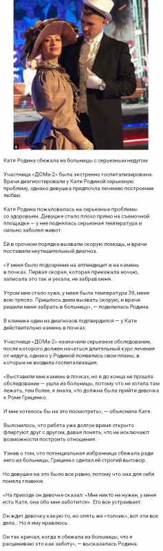 Однако сама Екатерина отнюдь не пожелала задерживаться в лечебном учреждении. Невзирая на то, что доктора стремились произвести детальное обследование и назначить серьезное лечение из-за наличия у Кати в почках камня, девушка сочла вполне возможным убежать из больницы, а причиной столь легкомысленного поведения Родиной послужил ее коллега по телепроекту Роман Гриценко.