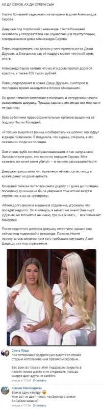 Несколько дней назад Анастасию буквально из собственного жилища доставили в отделение полиции. Причиной происшедшего произошла недавно состоявшаяся кража в жилище исполнителя Александра Серова. Выяснилось, что из его дома пропали золотая цепочка и сумма в 300 тысяч рублей, хотя сам певец уверен в том, что в случившемся виновна не Кочервей, а ее близкая приятельница Дарья Друзьяк.