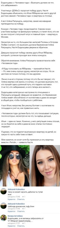 При этом сейчас в качестве лидера в негласном голосовании выступает будущая мать Алена Савкина, которой предстоит сражаться за московскую жилплощадь и гордое звание со своим прежним возлюбленным Ильей Яббаровым. Однако среди участников телешоу имеются и те, кто не намеревается содействовать Савкиной, считая, что Яббаров в большей степени заслуживает квартиры. К этой категории относится и Анастасия Ендальцева.
