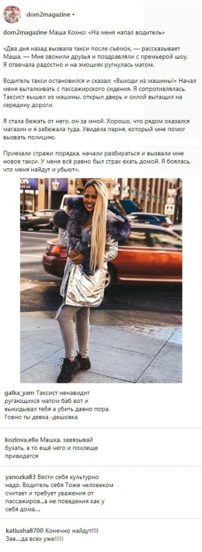 Бывшая участница телешоу рассказала, как ей удалось спастись от явно неадекватного таксиста. Маше едва не были нанесены серьезные телесные повреждения, более того, вполне возможно, что в отношении Кохно была предпринята подлинная попытка убийства.