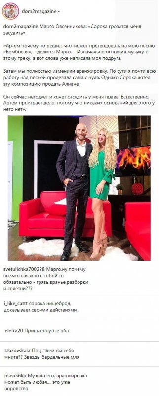 16 ноября 2018 года оказалось, что Артем Сорока планирует написать заявление в суд на свою экс-приятельницу Маргариту Овсянникову. Распрощавшись с реалити-шоу, девушка прилагает все усилия для развития карьеры в музыкальной отрасли. Совсем недавно Марго выпустила дебютную композицию, названную «Бомбовая», и песня сразу же искренне понравилась большинству ее подписчиков. Но Овсянниковой не удалось порадоваться собственному успеху в течение достаточно длительного времени. Выяснилось, что и Артем Сорока счел возможным заявить о наличии у него прав на композицию. Как утверждает молодой мужчина, именно им была приобретена музыка к треку, соответственно, и он должен получать хотя бы некоторую часть доходов и популярность, присвоенную Маргаритой. В отличие от Артема, который уже пообещал бывшей подруге встречу в суде, Овсянникова полагает, что она никому и ничего не должна. По словам прежней обитательницы периметра, она была вынуждена всецело изменить аранжировку композиции, тогда как слова написала приятельница Марго. Девушка не скрывает, что абсолютно всю работу над песней она выполнила собственными силами, без какого бы то ни было участия Сороки. К тому же Маргарита нисколько не тревожится и из-за суда, она стопроцентно уверена в том, что Артем не сможет ничего добиться подобным образом.