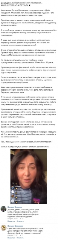 Накануне Даша разместила в Интернете пост, ставший ответом на видеоролик певицы. Девушка, которую действительно возмутили нападки Лолиты в ее адрес, намекнула читателям на то, что Милявская уже страдает определенными возрастными изменениями, причем Дарья однозначно имела в виду маразм. К тому же Друзьяк напомнила исполнительнице и обо всех ее брачных союзах, заметив, что не намеревается прибегать к рекомендациям неудачницы. Более того, Даша не стала молчать и о целом ряде пластических операций, которым подвергла себя Лолита. Бывшая участница телестройки посоветовала Милявской обратить внимание на тело и все же перестать постоянно перекраивать лицо.