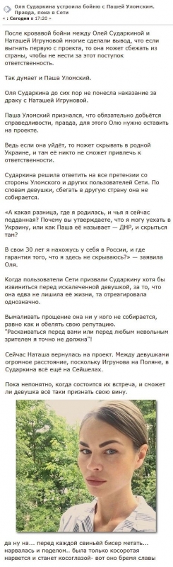 Подписчики уже предполагают, что Ольга не станет возвращаться обратно и поедет домой непосредственно с Сейшел. Сама Сударкина не опровергает подобной возможности, но и не скрывает, что не считает справедливыми нападки большинства поклонников телестройки по своему адресу. Девушка утверждает, что не намеревается умолять о прощении ни Наталью, ни фанатов телепередачи.