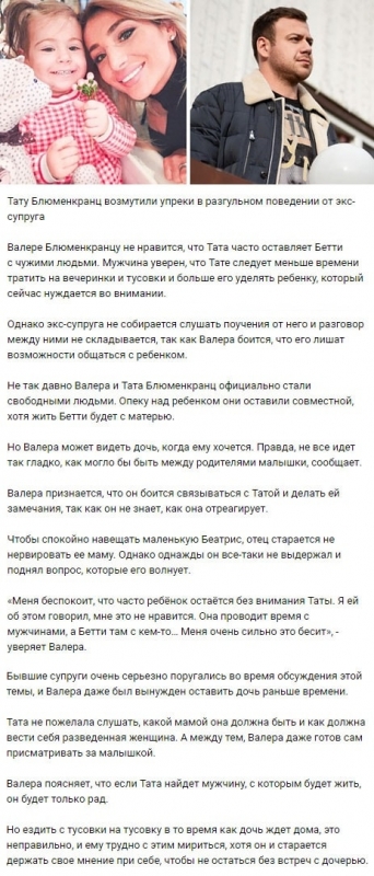 По словам Валеры, он ничего не имеет против того, чтобы у его бывшей жены произошли позитивные изменения в личной жизни. Но он абсолютно не желает мириться с ее фактически равнодушным и безответственным отношением к девочке. При этом саму Абрамсон глубоко возмущают и обижают высказывания прежнего мужа, Тата искренне недоумевает, чем обоснованы столь негативные выпады по ее адресу.