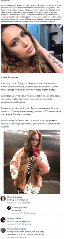Алена также не стала посвящать окружающих в подробности происшедшего. В своем микроблоге женщина опубликовала полный душевной боли пост, где откровенно подчеркнула, что ей снова, причем уже далеко не впервые, пришлось столкнуться с предательством. К тому же Ашмарина, судя по всему, никак не могла ожидать подобного отношения к себе.