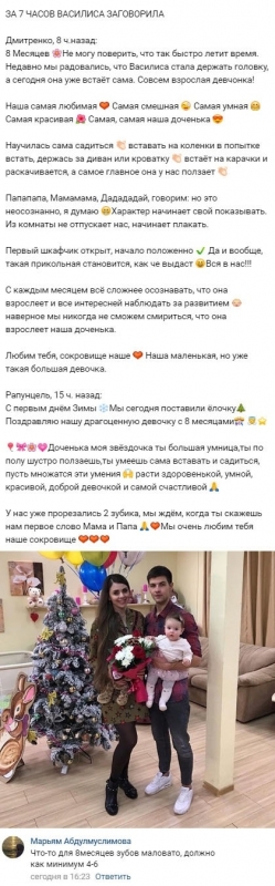 Дима с гордостью сообщил об успехе девочки, по его словам, Василиса наконец начала говорить, тогда как Оля написала о том, что она с нетерпением дожидается первых слов ребенка. Как утверждает Рапунцель, ее дочь еще не произнесла ни единого слова, в то время как Дмитренко рассказывает, что малышка уже пробует говорить «дай», «мама» и «папа».