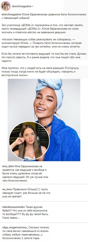 Ефременкова немедленно отреагировала на высказывания Колисниченко. Телеведущая без всяких церемоний посмеялась над тем, что Екатерина и сейчас всячески стремится находиться в центре всеобщего внимания, добиваясь этого любыми способами, в частности, постоянными визитами на самые примитивные и низкопробные шоу. К тому же Юлия не стала скрывать, что Катя, как считает сама Ефременкова, всего лишь испытывает к ней обыкновенную зависть. При этом ведущая телестройки заметила, что такие выпады по ее адресу не имеют для нее никакого значения.