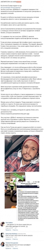 Однако стремление посмеяться над дамой привело к серьезным последствиям для Антона. Женщина, именуемая Еленой, сначала попыталась добиться наказания для Гусева у руководства фитнес-центра, однако, поскольку ее требования не были удовлетворены, она вознамерилась увидеться с супругом Виктории Романец непосредственно в зале суда. Как утверждает Елена, из-за Антона ее не оставляют в покое, постоянно присылая ей фотографию из спортклуба с ироничными комментариями и бесцеремонными насмешками.