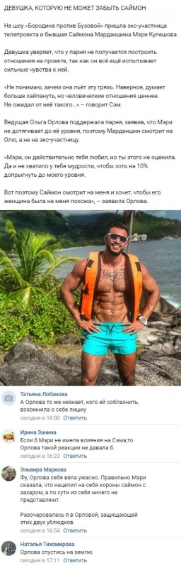 1 декабря 2018 года телеведущая Ольга Орлова резко поставила на место молодую женщину из числа бывших участниц телевизионного проекта, попытавшуюся добиться расположения Саймона Марданшина. Фанатам реалити-шоу давно известно о том, что Оле явно нравится этот подопечный. К тому же и сам парень не отрицает того, что он не может откровенно проявить свою симпатию к Орловой только в связи с необходимостью соблюдения субординации на телестройке. На сегодняшний день Ольга остается для Саймона только музой, как утверждает участник телепередачи. Но Мэри Кулешова, снова оказавшись в периметре, выдвинула собственное предположение относительно того, по какой причине у Марданшина все еще не имеется постоянной подруги. В ходе ток-шоу «Бородина против Бузовой» Кулешова подчеркнула, что Саймон и сейчас неравнодушен к ней, в связи с чем его нисколько не волнуют другие представительницы прекрасного пола и тем более проектные телеведущие. Однако Мэри быстро пожалела о своих высказываниях. Орлова жестко осадила молодую женщину в присутствии ее бывшего возлюбленного. Делая вид, что она старается оказать поддержку Марданшину, Ольга заметила, что Кулешова никогда не будет находиться на одном с нею уровне. Ведущая телешоу подчеркнула, что Саймон мечтает о том, чтобы его будущая приятельница выглядела именно так, как Орлова. Но молодому мужчине еще не удалось найти подобную девушку.