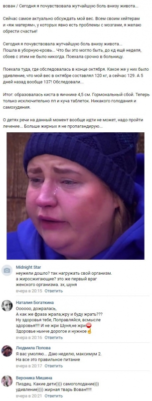 Подписчики, регулярно предупреждающие Черно о том, что поглощение жирной и калорийной еды без всякой меры приведет супругу Иосифа Оганесяна к самым печальным последствиям, теперь могут искренне порадоваться исполнению их предсказаний. Саша сообщила фолловерам о том, что у нее диагностирована серьезная болезнь.