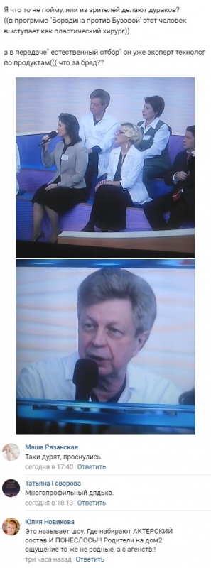 17 января 2019 года поклонникам телестройки стало понятно, что телеведущие Ольга Бузова и Ксения Бородина самым бессовестным образом обманывают телезрителей в процессе ток-шоу «Бородина против Бузовой». Фанаты телепередачи нередко сомневаются в том, являются ли приглашаемые на это шоу эксперты действительно компетентными и высококлассными профессионалами. В этом нет ничего удивительного, поскольку многие из гостей студии действительно не в состоянии дать сколько-нибудь полезных рекомендаций, они лишь провоцируют развитие очередного скандального конфликта между героями телепроекта. Однако поклонники телепрограммы все же не предполагали, что телеведущие и организаторы телестройки позволяют себе столь беспардонно лгать миллионам людей. Внимательные телезрители совершенно случайно обнаружили явный обман, когда в студии городских квартир появился человек, назвавший себя специалистом в области пластической хирургии. Однако этот мужчина уже в другой телепередаче представился технологом, занимающимся продуктами. Несложно догадаться о том, что на самом деле он не имеет отношения ни к одной из указанных профессий, занимаясь лишь хождением по различным шоу и обеспечивая таким образом собственное существование.