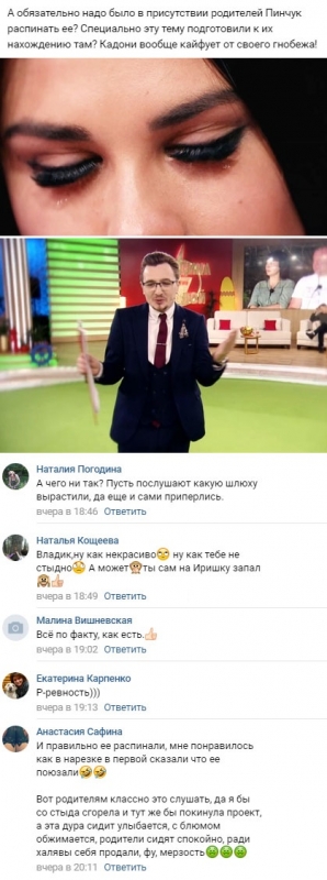 Правда, поведение Влада все же осуждают не все телезрители. Некоторые полагают, что Пинчук вполне заслуживает подобного некорректного обращения со стороны телеведущего, более того, ее близким необходимо узнать о том, что на самом деле представляет собой их дочь.