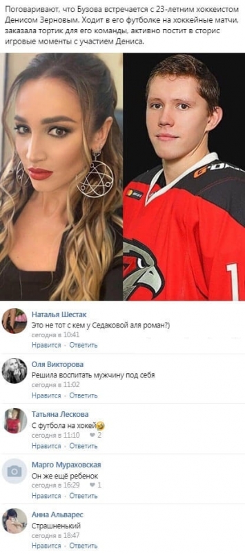 22 апреля 2019 года подписчики узнали о том, с кем у телеведущей Ольги Бузовой в настоящее время имеются романтические отношения. Еще совсем недавно Оля всячески стремилась никак не афишировать перед публикой собственную личную жизнь. Правда, сама телезвезда постоянно говорила о том, что после крайне тяжело пережитого развода с Дмитрием Тарасовым она вовсе не торопится искать для себя нового возлюбленного. Но накануне оказалось, что в течение всего этого времени Бузова не сообщала поклонникам всей правды. Ходят слухи о том, что Ольгу заинтересовал хоккеист Денис Зерновой, несмотря на то, что парню минуло всего 23 года. Судя по всему, общение между этими двумя уже явно выходит за рамки обыкновенной дружбы. К примеру, телеведущая носит футболку, на которой красуется имя Зернового, заказывает сладости для всей команды, в которой играет Денис, к тому же она стремится не пропускать ни одного матча с участием этого юноши. При этом подписчиков крайне удивляет сделанный Бузовой выбор. Многие из них считают, что Оля опять повторяет уже сделанную ошибку, поскольку ей уже довелось быть замужем за спортсменом. В то время молодая женщина также посещала буквально все игры, являясь искренней фанаткой, однако ее преданность супругу осталась неоцененной.