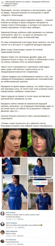 26 мая 2019 года ведущая реалити-шоу Ксения Бородина не постеснялась подвергнуть явному унижению участницу телевизионной программы Александру Черно. Всем прекрасно известно о том, что над излишними килограммами супруги Иосифа Оганесяна откровенно смеются не только поклонники телепроекта, но и телеведущие. Сашу постоянно критикуют за ее чрезмерно крупные габариты и несомненное пристрастие к весьма калорийным продуктам питания, поглощаемым ею в огромных количествах. К тому же накануне Ксения Бородина позволила себе от души поиздеваться над новым нарядом Александры. В своем сториз Ксюша разместила последнюю фотографию Черно, одетой в платье синего цвета. Правда, сама Бородина восприняла обновку молодой женщины как самый обыкновенный мешок, предназначенный для выноса мусора, который к тому же оказался натянутым на нечто, являющееся абсолютно безразмерным. Хотя со словами Ксении сложно не согласиться, подписчики буквально потрясены ее бестактностью. Большинство фолловеров полагают, что Бородина однозначно переходит границы допустимого с подобными унижениями, носящими к тому же публичный характер. Во всяком случае, никого не должно касаться то, как предпочитает одеваться и питаться жена Оганесяна, что полностью относится и к ведущим телепередачи.