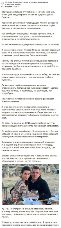 14 июня 2019 года гости одного из развлекательных заведений были просто потрясены тем, до какой степени неаккуратно и даже неряшливо выглядела телеведущая Ксения Бородина, находящаяся под несомненным воздействием спиртных напитков. Ксюша, состоящая в благополучном браке с Курбаном Омаровым, в течение достаточно длительного времени предпочитала вообще не посещать ночные клубы и не участвовать в каких-либо гулянках. Ксения чрезвычайно редко бывала даже на девичниках в компании приятельниц, однако выяснилось, что молодая женщина все же не смогла целиком и полностью отказаться от того образа жизни, которого она придерживалась в прошлом. В Интернете широко обсуждается визит Ксюши в увеселительное заведение. Ведущая телестройки пришла туда вместе с подругами и, судя по всему, действительно устроила себе настоящий праздник. Как утверждают свидетели, Бородина вела себя чрезвычайно некорректно и грубо, позволяя себе употребление непристойных выражений и крайне резко беседуя с обслуживающим персоналом. Потребовалось совсем немного времени для того, чтобы Ксения из-за алкоголя впала в явно неадекватное состояние. Многих также просто изумил ее внешний вид. Популярная телеведущая без всякого стеснения предстала перед публикой в далеко не самых чистых шортах, абсолютно несвежей футболке и с волосами, которые молодая женщина однозначно давно не мыла.