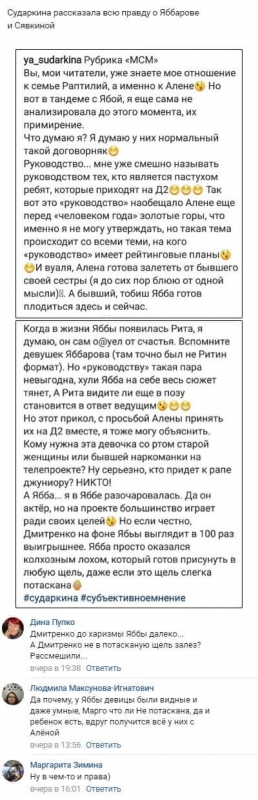 13 июня 2019 года бывшая участница телепрограммы Ольга Сударкина сочла необходимым прокомментировать воссоединение Алены Савкиной и Ильи Яббарова. Совсем недавно Оля всячески критиковала Савкину, выражая явное сомнение в том, что Алена сумеет стать достойной матерью, в то же время Сударкина откровенно восхищалась Маргаритой Ларченко и Ильей Яббаровым. Но теперь от Ольги как следует досталось уже молодому мужчине из-за его примирения с матерью его сына. Выяснилось, что Сударкину глубоко разочаровало случившееся, более того, она уверена, что эти двое в течение всего последнего времени действовали по изначальной договоренности, и организаторы телестройки также находились полностью в курсе дела. К тому же теперь Алена настаивает на том, что опять прибудет на Поляну только с Яббаровым, молодая мама наотрез отказывается возвращаться на телепроект в одиночестве. Однако Олю и этот факт нисколько не удивляет. Как утверждает Сударкина, Савкина, которая, по ее словам, употребляет запрещенные вещества и обладает ртом не юной девушки, а пожилой женщины, едва ли заинтересует кого-либо другого. В то же время и для самого Ильи существует единственный шанс вернуться на телепередачу. Однако Ольга оценивает столь явную актерскую игру как чрезмерную даже для столь непорядочного человека, каким она считает Яббарова.
