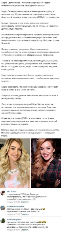 Маргарита сообщила о происшедшем своим подписчикам в социальной сети Инстаграм. По словам Марго, ее буквально потрясло, как вела себя Бородина, не перестававшая откровенно оскорблять и унижать Овсянникову в течение всего съемочного процесса. Как утверждает экс-героиня телестройки, поведение Ксюши было совершенно непрофессиональным, Бородина не только слишком много говорила, но и повышала голос до крика, причем ее необъективность однозначно бросалась в глаза.