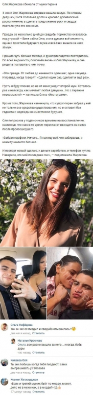 13 июля 2019 года стало известно, что бывшая участница телестройки Ольга Жарикова совершила побег от жестокого супруга, позволившего себе избить женщину уже по прошествии месяца после бракосочетания. Буквально год назад Оля намеревалась связать жизнь с Александром Гобозовым. Но за пределами периметра эти двое оставались вместе совсем недолго. Расставшись с Сашей, Жарикова вернулась к себе на родину, в Санкт-Петербург, и в течение некоторого времени не торопилась обзаводиться новым возлюбленным. Но Виктор Соловьев сумел добиться расположения девушки. Мужчина, который ранее был для Ольги всего лишь другом, принялся столь настойчиво и при этом красиво за нею ухаживать, что Жарикова решилась на сближение с ним. Немногим более месяца назад Оля и Витя стали официальными супругами. Правда, за неделю до этого события Жарикова готова была отказаться от намеченного замужества, девушка откровенно рассказала фолловерам о жестокости избранника, который вел себя с нею как настоящий тиран. Видимо, молодая женщина напрасно простила мужу применение физической силы. Накануне Оля проинформировала подписчиков о том, что Виктор снова был весьма агрессивен, и подчеркнула, что на этот раз она окончательно разрывает их отношения. К тому же Соловьев не только поднял на Жарикову руку, но и отобрал у Ольги все, что подарил ранее, а также некоторые из ее личных вещей и даже денежные средства.