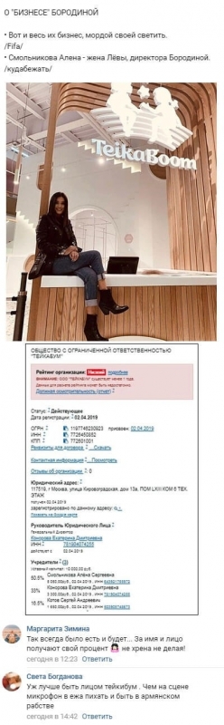 Фолловеры сумели узнать о том, кому на самом деле принадлежит указанное заведение. Исходя из информации, размещенной на сайте рейтинга организаций, в качестве генерального директора данного центра выступает Алена Смольникова, жена Льва Смольникова, директора Ксюши. В то же время сама Бородина, видимо, всего лишь получает определенный процент от деятельности этого заведения благодаря известному имени. Вполне возможно, что и маникюрным салоном в действительности владеет другой человек.