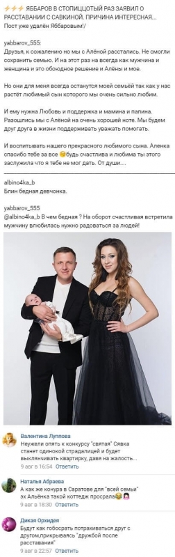 10 августа 2019 года Илья Яббаров сообщил своим подписчикам о том, что он окончательно распрощался с матерью его сына Аленой Савкиной. Всем известно о том, что Савкина и Яббаров без особых успехов стараются восстановить отношения ради их общего наследника Богдана. Но при этом как коллегам этой пары по реалити-шоу, так и телезрителям абсолютно ясно, что между Аленой и Ильей не имеется ни пылкой страсти, ни иных сколько-нибудь нежных чувств. При этом если младшая сестра Ольги Рапунцель относится к бойфренду хотя бы с некоторой теплотой, то Яббаров даже не скрывает того, насколько его тяготит компания этой женщины. Еще неясно, что спровоцировало очередной разрыв участников телестройки. Однако Илья настаивает на том, что теперь он полностью прекращает все попытки оставаться возлюбленным для мамы его ребенка. При этом, как подчеркивает молодой мужчина, решение о расставании он и Алена приняли по взаимному согласию, и распрощались, по словам Яббарова, вполне дружески и без всяких претензий. В своем микроблоге Илья даже выразил Савкиной благодарность и горячо пообещал всегда оказывать ей поддержку и помощь в нелегкие жизненные моменты. К тому же он, как подчеркивает сам Яббаров, отнюдь не отказывается участвовать и в воспитании Богдана. Он стопроцентно уверен в том, что малышу в равной степени необходимы оба родителя.