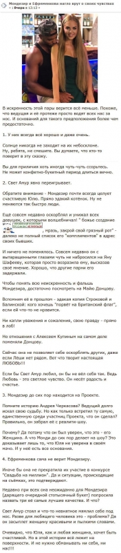 Однако данное обстоятельство является лишь первым доказательством того, что Свет-Амур и Юлия лгут по поводу своей невероятной любви. Выяснилось, что многим из фолловеров чрезмерно идилличные чувства Мондезира к подруге кажутся однозначно показными. Любители телепроекта еще отлично помнят, как грубо и бесцеремонно этот молодой мужчина обращался с прежними приятельницами, постоянно повышая на девушек голос. Большинство фанатов реалити-шоу просто не верят в то, что Юля, обладающая весьма вспыльчивым нравом и не привыкшая «придерживать» свой язык, еще ни разу не вывела избранника из терпения. К тому же совсем недавно Свет-Амур едва не покалечил Яну Шафееву, утратив всякий контроль над собственными эмоциями. Однако с Ефременковой мулат по неизвестным причинам ведет себя совершенно иначе, никогда не возражая Юлии и не пытаясь с нею спорить.