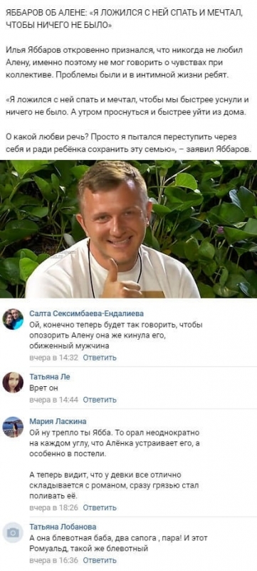 8 августа 2019 года участник телевизионной программы Илья Яббаров, охваченный чувством ревности, огласил во всеуслышание трудности, имевшиеся у него в процессе интимных взаимоотношений с прежней приятельницей Аленой Савкиной. Невзирая на то, что сам Яббаров всячески старается продемонстрировать всем вокруг, что ему совершенно безразличны новые отношения, возникшие у матери его сынишки Богдана, фолловерам совершенно ясно, что в действительности Илья всерьез переживает из-за того, что Алена предпочла ему Романа Макеева. Мужчина явно ревнует бывшую подругу, хотя и не желает признаться в этом хотя бы самому себе, более того, Яббарова стопроцентно огорчает то, что сам он все еще остается одиноким, тогда как Савкина уже усиленно развивает роман с другим человеком. Правда, при общении с товарищами по телестройке Илья старается представить положение вещей абсолютно иначе. Мужчина твердит о то, что он не придает какого бы то ни было значения тому, с кем в настоящее время находится Алена. Более того, Яббаров подчеркивает, что между ними и не присутствовало настоящих взаимных чувств даже в тот период, когда он и Савкина вели совместное существование. По словам самого Ильи, он в действительности никогда искреннее и не любил младшую сестру Ольги Рапунцель. Именно в связи с этим обстоятельством герой реалити-шоу всегда категорически отказывался обсуждать собственные эмоции и ощущения в процессе лобных мест, когда от него фактически требовали искренних признаний. Но значительно более тяжелыми для Яббарова были моменты, проводимые за балдахином. Мужчина сообщил, что он обычно буквально молился о том, чтобы немедленно уснуть и таким образом избежать выполнения определенных обязанностей по отношению к Алене. В дальнейшем, с приходом утра Илья старался как можно раньше оставить дом и не общаться с сожительницей.
