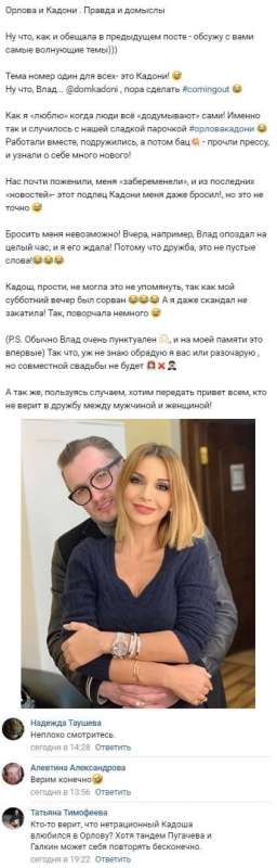 При этом сама Оля продолжает резко отрицать все соответствующие слухи. В том же посте, опубликованном женщиной в ее аккаунте в Инстаграме, Орлова постаралась убедить фолловеров в том, что в действительности между нею и Кадони существует лишь самая обычная дружба.