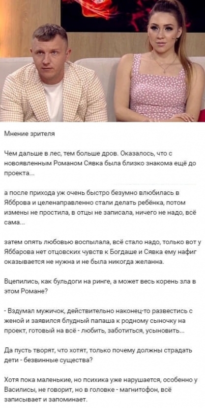 14 сентября 2019 года в виртуальном пространстве зашла речь о подлинном отце отпрыска Алены Савкиной. В то время как Илья Яббаров наслаждается жизнью на Острове любви, стараясь завоевать расположение Анастасии Голд, о его маленьком сынишке Богдане заботится другой человек. Бойфренд Савкиной Роман Макеев, еще не успевший даже оформить развод со своей теперешней женой, уже мечтает заключить официальный брак с Аленой, более того, он вполне готов и к столь серьезному шагу, как усыновление ее малыша. К тому же Роман уже теперь добросовестно исполняет в отношении Богдана все отцовские обязанности. Фолловерам многое стало ясно после сплетен, уже широко распространившихся в социальных сетях. Как оказалось, Савкина и Макеев на самом деле были знакомы еще до участия в телевизионном шоу. К тому же их общение было отнюдь не просто дружеским, в связи с чем Рома действительно может являться и биологическим папой ребенка Алены. Именно указанное обстоятельство также способно быть и причиной того, что ранее младшая сестра Ольги Рапунцель не пожелала простить Илье Яббарову якобы измену с его стороны. Более того, Савкина даже не стала вписывать Яббарова в графу об отцовстве в свидетельстве о рождении Богдана.
