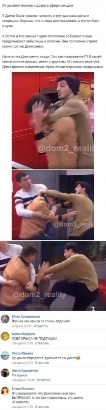 Случившаяся недавно ссора Черно и Оганесяна с четой Дмитренко едва не завершилась по-настоящему трагически. Стоит учитывать тот факт, что уже в течение недели Иосиф и Дима не в силах наладить отношения, прежде всего, из-за того, что Дмитрий желает оказаться на месте товарища по телестройке в соревновании «Человек года».