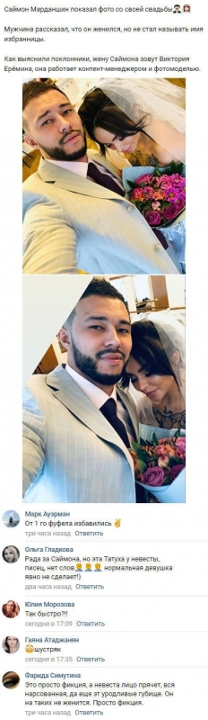 26 января 2020 года пользователей социальных сетей привели в крайнее изумление снимки, сделанные в процессе бракосочетания экс-участника телевизионного шоу Саймона Марданшина. Ни для кого не является секретом, что молодой человек еще во время нахождения на телестройке мечтал встретить настоящую любовь и создать крепкую семью. При этом у парня никогда не было недостатка в приятельницах, но Саймон так и не решился в период пребывания на телепроекте сделать окончательный выбор в пользу кого-либо из представительниц прекрасного пола. Всем известно и о том, что последнюю попытку построить отношения на телепрограмме Марданшин предпринял с Анастасией Якуб. Но, невзирая на все надежды поклонников этой пары, за пределами периметра Настя и Сэм, распрощавшиеся еще на телепередаче, так и не смогли опять воссоединиться. Но если судить по новейшим фотографиям, Марданшин вовсе не тратил напрасно времени с момента его расставания с шоу. Виртуальное пространство потрясли фотоснимки, запечатлевшие свадебную церемонию Саймона и его избранницы. Оказалось, что невестой Сэма стала Виктория Еремина, контент-менеджер и фотомодель, которая полностью соответствует предпочтениям и вкусам прежнего героя телепроекта. Однако фолловеры продолжают искренне удивляться тому обстоятельству, что ранее Марданшин никогда не размещал на просторах Интернета фотографий в компании Вики.