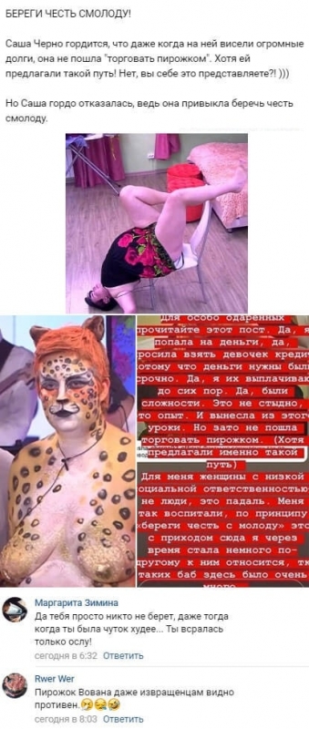 Александра рассказала подписчикам о том периоде в ее жизни, когда она находилась в чрезвычайно сложной и фактически безвыходной финансовой ситуации. По словам самой Саши, она и сейчас испытывает искреннюю гордость за саму себя в связи с тем, что она в тот нелегкий момент все же сумела не «скатиться», как это происходило со многими другими девушками. Как утверждает Черно, ей тогда предлагали зарабатывать путем оказания определенных услуг, но жена Оганесяна все же не пожелала пойти столь недостойным путем.