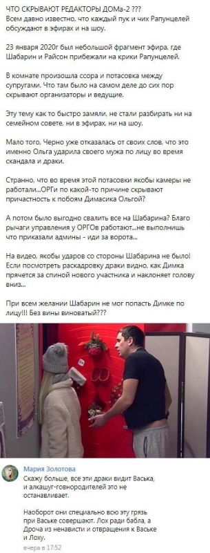 30 января 2020 года поклонники телевизионного шоу убедились в том, что руководство телестройки старается скрыть от зрителей весьма некрасивый случай, происшедший в комнате «проектных брендов» Дмитрия Дмитренко и Ольги Рапунцель. Совсем недавно супруги, которые регулярно конфликтуют с коллегами по телепередаче, поссорились и между собой. Всем уже известно о том, что из-за громких криков, доносившихся из помещения, занимаемого данной семьей, к ним были вынуждены поторопиться Андрей Шабарин и Розалия Райсон. Роза и Андрей искренне встревожились, предполагая, что Дмитренко мог применить физическую силу в отношении Оли, готовящейся к появлению на свет второго малыша. Но в результате оказалось буквально невозможным разобраться в том, что же в действительности случилось в комнате четы Дмитренко, причем любителей телепроекта проинформировали, что в этот момент камеры якобы были повреждены. Дмитрий упомянул лишь о том, что он не смог сохранить равновесие в связи с тем, что жена от души дала ему пощечину. Однако организаторы телешоу поторопились как можно быстрее замять соответствующий инцидент. Приверженцы телепроекта пытаются догадаться, что же на самом деле стараются скрыть руководители программы. Зрители допускают, что в реальности организаторы телестройки усердно прикрывают Ольгу Рапунцель, ставшую весьма агрессивной и использующую рукоприкладство при скандалах с супругом. Некоторые из поклонников шоу полагают, что именно в связи с подобным поведением со стороны Оли синяки на лице Димы позднее были приписаны действиям Андрея Шабарина.