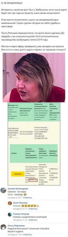 На просторах Интернета размещены данные, взятые с ресурса судебных приставов. Теперь фолловеры уже нисколько не сомневаются в том, что на самом деле Александра действительно является аферисткой. Подписчикам стало понятно, что долг Черно неким лицам составляет около 400 тысяч рублей. При этом сама жена Оганесяна, невзирая на то, что она постоянно твердит о собственной безукоризненной честности и порядочности, вовсе не торопится «гасить» данную задолженность.