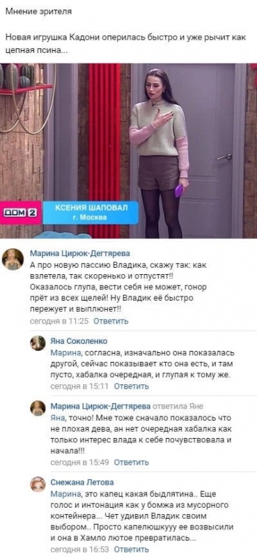 10 февраля 2020 года новая жительница периметра Ксения Шаповал, ощутив несомненную поддержку со стороны симпатизирующего ей проектного телеведущего Влада Кадони, показала себя в чрезвычайно неприглядном свете. Прежняя приятельница Сергея Захарьяша, появившаяся на телепрограмме с намерением прекратить его взаимоотношения с Алесей Семеренко, уже успела заинтересоваться другим представителем противоположного пола. Всем отлично известно о том, что Ксюша не стала скрывать расположения к Владу Кадони, в то время как и сам мужчина отнюдь не против пообщаться с нею более тесно. Но именно симпатия со стороны Кадони и продемонстрировала всем далеко не слишком приятную истинную сущность Ксении. В ходе дневного эфира телешоу от 10 февраля Шаповал, считая себя некоей исключительной и неприкосновенной на телепрограмме персоной, набросилась на коллегу по телестройке Дмитрия Тузова. Оказалось, что Ксюше не особенно нравится то, в какой манере Тузов общается с товарищами по передаче, причем Шаповал поспешила выразить свое возмущение юноше в достаточно резкой форме. Пока сама Ксения видит в себе фактически «королеву телепроекта», у телезрителей ее наивность вызывает только искренний смех. Едва ли не все фанаты реалити-шоу полагают, что Шаповал будет совсем недолго пребывать под защитой Кадони, и весьма скоро Ксюша будет изгнана за пределы периметра, если она не начнет вести себя более корректно и уважительно по отношению к окружающим.