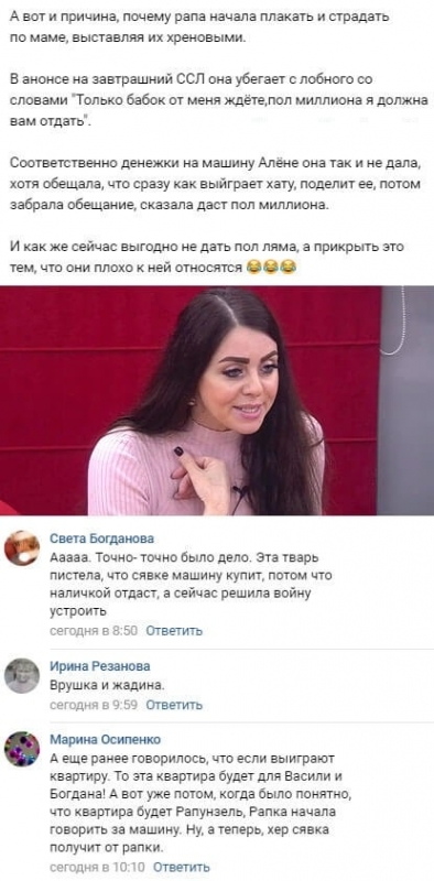 Но уже совершенно ясно, что подлинная причина конфликта Рапунцель с родительницей и сестрой заключается в абсолютно ином обстоятельстве. Всем прекрасно известно о том, что Оля, ставшая лидером соревнования «Человек года», уверенно обещала вручить Алене утешительный приз. Мама маленькой Василисы собиралась преподнести родственнице денежные средства для приобретения машины. Более того, Ольга указывала даже планируемую сумму подарка, речь шла о 500 тысячах рублей.