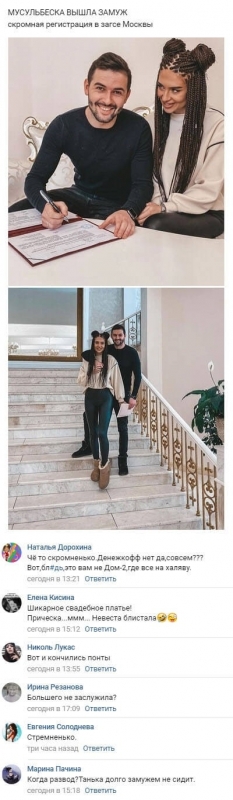 14 февраля 2020 года в социальных сетях появились фотографии, сделанные в процессе бракосочетания бывшей участницы телепроекта Татьяны Мусульбес. Ни для кого не является секретом тот факт, что уже в конце завершившегося года Таня и ее экс-супруг Виктор Литвинов оформили развод, причем их пребывание в статусе жены и мужа оказалось крайне недолговременным. Однако Мусульбес вовсе не осталась в одиночестве после расставания с Витей. Еще в период существования прежней семьи Татьяне уже сделал предложение выйти замуж ее новый возлюбленный, тогда как молодая женщина без всяких раздумий согласилась стать его супругой. Оказалось, что заключить брачные союз эти двое решили в особенный, символичный день, а именно 14 февраля. При этом никакого пышного торжества Таня и ее новоиспеченный муж устраивать не стали. Накануне в виртуальном пространстве были распространены фотоснимки Мусульбес и ее новоиспеченного спутника жизни Сергея Михи, которые были сделаны в одном из ЗАГСов Москвы. Татьяна и Сергей прибыли на церемонию заключения брака без каких-либо приглашенных гостей, и подписчики сразу заметили, что женщина рядом с избранником выглядит невероятно счастливой. Однако отнюдь не все выразили желание поздравить прежнюю героиню телестройки с происшедшей в ее жизни позитивной переменой. Некоторые откровенно упрекнули Таню в несомненной жадности, напомнив ей о том, какое грандиозное торжество она в прошлом устроила себе за счет телепрограммы. Как язвительно подчеркнули хейтеры, самостоятельно организовать подобный праздник Мусульбес однозначно не пожелала.