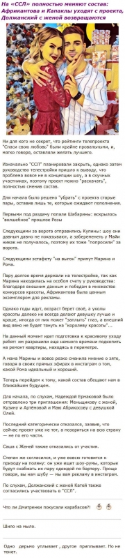 18 февраля 2020 года фолловеры узнали о том, кто уже в ближайшем будущем заменит на телевизионном шоу семью Марины Африкантовой и Романа Капаклы. Поклонники телепрограммы не могут не замечать того, что количество героев проекта «Спаси свою любовь» быстро уменьшается. Несколькими днями ранее с передачи ушли супруги Розалия Райсон и Андрей Шабарин. К тому же, исходя из последних сплетен, организаторы телестройки собираются как можно скорее проститься и с парой Майи Донцовой и Алексея Купина. Однако перемены в составе участников телешоу, судя по всему, этим не ограничатся. Оказалось, что еще одну семью персонажей телепроекта уже активно готовят к уходу за ворота. Вскоре за пределы периметра предстоит отправиться и молодоженам Марине Африкантовой и Роману Капаклы. Правда, учитывая благосклонность руководства телепрограммы к названной паре, им будет позволено еще в течение определенного периода зарабатывать материальные ресурсы для выполнения ремонта в квартире. При этом руководители телепроекта уже решили, кем именно они заменят Рому и Марину. Всем уже известно о том, что свободное место на шоу «Спаси свою любовь» предлагалось семье Евгения Кузина и Александры Артемовой, речь шла также о приезде на телепередачу Мая Абрикосова и его нынешней возлюбленной. Но в итоге телезрителей в ходе дальнейших эфиров ожидает созерцание развития отношений Николая Должанского и Екатерины Богдановой.