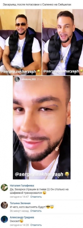 19 февраля 2020 года подписчики Сергея Захарьяша увидели побои, полученные парнем из-за потасовки, случившейся у него с товарищем по телевизионному шоу Захаром Саленко. Поклонники телестройки отмечают, что Захарьяшу и его подруге Алесе Семеренко чрезвычайно не везет. Едва успев приехать на Остров любви, Алеся и Сергей уже оказались в самом эпицентре громкого скандала, и всем уже известно о том, что Анна Левченко не постеснялась применить физическую силу, выясняя отношения с Семеренко. Вскоре точно так же из-за рукоприкладства со стороны коллеги по телепрограмме пострадал и Захарьяш. Накануне в Сети был опубликован сториз Татьяны Строковой, центральным персонажем которого оказался Сергей, к тому же Таня привлекла всеобщее внимание к его лицу, в частности, к подбитому глазу молодого человека. При этом уже выяснилось, что случилось в действительности. Любители телепроекта уже давно заметили, что Захар Саленко склонен вести себя довольно агрессивно, в особенности в последнее время. Жертвой негативных эмоций Захара и его неумения управлять собой не раз становилась его возлюбленная Яна Шафеева. Теперь ярость Саленко обрушилась и на Захарьяша, правда, все подробности потасовки между ребятами еще неизвестны телезрителям. Фолловеров также весьма интересует, ожидает ли Захара какое-либо наказание за то, что он позволил себе рукоприкладство, в результате которого Сергей рисковал потерять зрение.