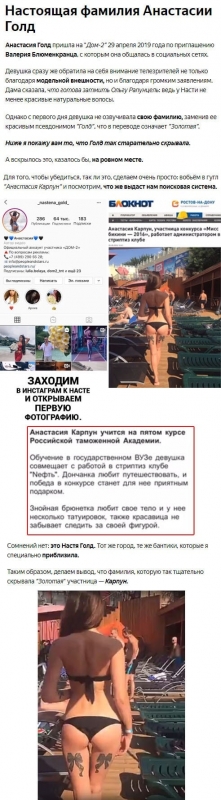 24 февраля 2020 года приверженцам телепрограммы стала известна вся правда об истинной фамилии участницы телепроекта Анастасии Голд, а также о том, чем Насте довелось заниматься ранее, до того, как она оказалась в числе героев телепередачи. Ни для кого не является секретом, что персонажи телешоу нередко скрывают свою подлинную личность под придуманными ими псевдонимами. Если говорить об Алексее Самсонове, то он прежде являлся Лешей Свешниковым, а Ольга Григорьевская, принявшая после бракосочетания фамилию Дмитренко, гораздо более известна поклонникам телестройки под прозвищем Рапунцель. Но Анастасия Голд в течение достаточно длительного периода времени лгала товарищам по шоу и телезрителям. Девушка старалась заверить всех в том, что действительно носит фамилию Голд, однако внимательные подписчики уже разоблачили обман Насти. Фолловеры без лишних усилий смогли установить, что на самом деле фамилия этой участницы передачи Карпун, что, безусловно, не кажется столь же романтичным и впечатляющим, как Голд. К тому же Анастасия явно лжет и в плане того, что касается ее работы до прихода на проект. Как утверждает сама Настя, она, хотя и была сотрудницей стриптиз-бара, но занималась всего лишь встречей гостей. Однако при этом почти никто из любителей телестройки нисколько не сомневается в том, что в реальности Голд однозначно исполняла далеко не самые приличные танцы, при этом подписчики вполне допускают и возможность оказания Настей определенных услуг посетителям соответствующего заведения.