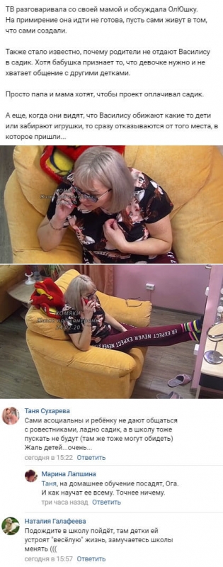 Реальное положение вещей полностью прояснила мама Оли. Беседуя со своей родительницей, Татьяна Владимировна, которая в настоящее время крайне обижена на старшую из дочерей, не стала скрывать настоящей причины нахождения Василисы дома. Оказалось, что чета Дмитренко совершенно не стремится тратить собственные финансовые ресурсы и требует, чтобы руководство телепрограммы целиком оплачивало пребывание девочки в саду. К тому же Дима и Оля однозначно чрезмерно болезненно воспринимают проблемы в процессе общения их наследницы со сверстниками. Как только у кого-либо из родителей Василисы создается впечатление, что их ребенка хотя бы пытаются обидеть другие малыши, они тут же уходят, забрав с собой дочь.